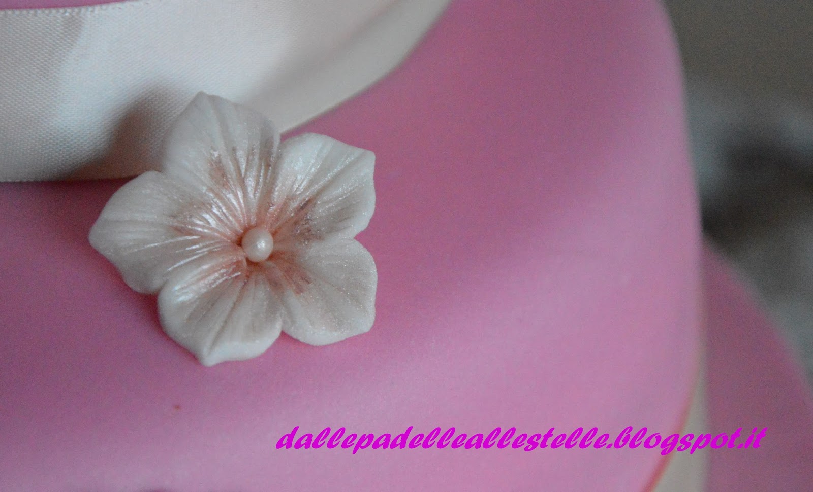 Sulla torta superiore, invece, abbiamo sparso tanti fiorellini con delle perline rosa al centro e come topper abbiamo realizzato delle scarpine da bimba (erano così tenere ma soprattutto sembravano reali!!!)
